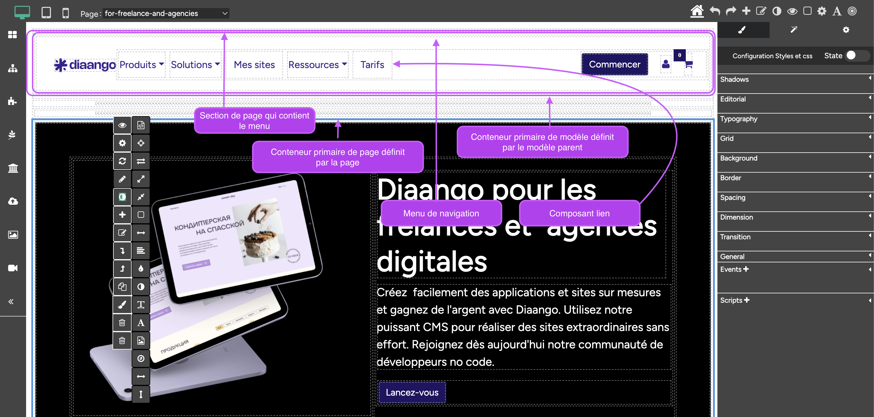 - Le menu latéral de droite permet une édition avancée des feuilles de style, des paramètres d'un composant et son animation.